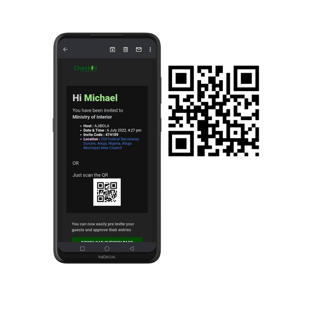 CheckNIN Location Visitors with smart phones can download CheckNIN Location PASS verify themselves and simply tap the QR Code provided at the port of entryÂ